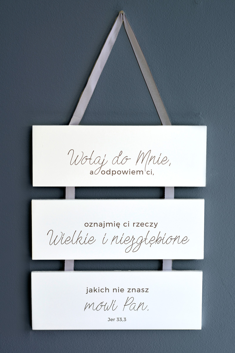 Dekoracja ścienna – tryptyk o wymiarach 20 cm x 21 cm, jest piękną dekoracją ze wspaniałymi słowami z Pisma Świętego. „Wołaj do mnie a odpowiem Ci, oznajmię ci rzeczy wielkie i niezgłębione jakich nie znasz mówi Pan. „Jer. 33,3. Tryptyk to rodzaj dekoracji ściennej która składa się z trzech deseczek o wymiarach 7 x 21 cm. Całość połączona jest wstążką w kolorze szarym.  Tryptyk to ciekawe uzupełnienie każdego wnętrza. Boże słowo zamieszczone na tryptyku będzie ciekawym akcentem i uzupełnieniem wnętrza.  Miłym drobiazgiem na urodziny, imieniny. Taki podarunek może być alternatywą do wielu standardowych drobiazgów którymi obdarowujemy się z bliskimi przy okazji różnych wizyt.
