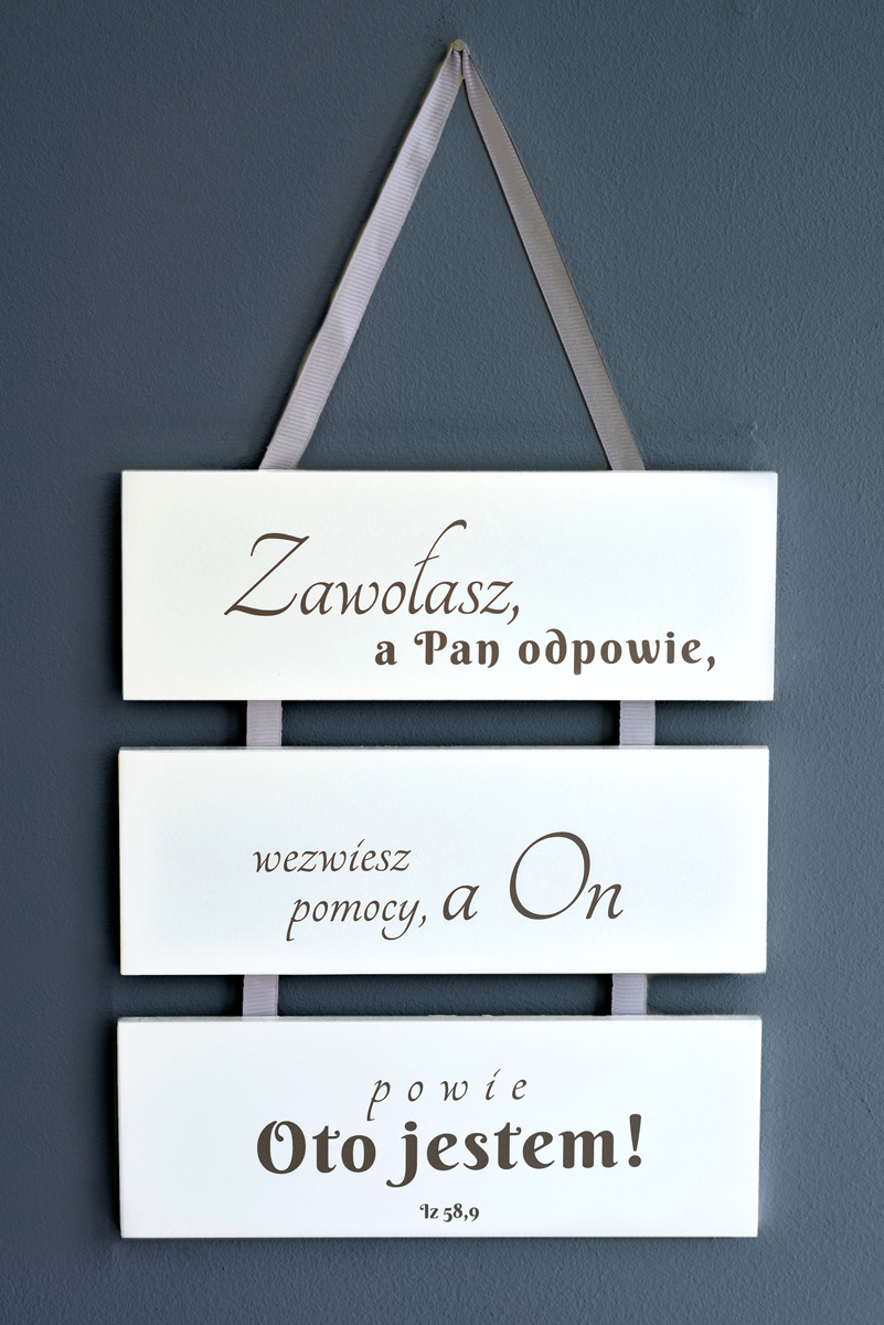 Tryptyk to rodzaj dekoracji ściennej, która składa się z trzech deseczek o wymiarach 7 x 21 cm. Całość połączona jest wstążką w kolorze szarym. Tryptyk to ciekawe uzupełnienie każdego wnętrza. Boże słowo zamieszczone na tryptyku będzie ciekawym akcentem i uzupełnieniem wnętrza. Miłym drobiazgiem na urodziny, imieniny. Taki podarunek może być alternatywą do wielu standardowych drobiazgów którymi obdarowujemy się z bliskimi przy okazji różnych wizyt.